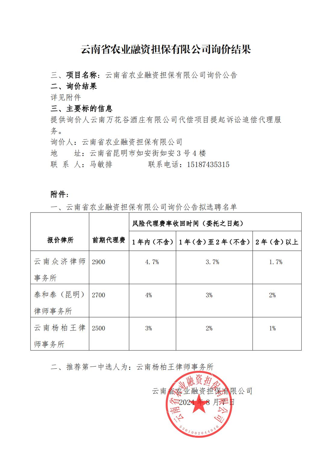 云南省農(nóng)業(yè)融資擔(dān)保有限公司詢價結(jié)果