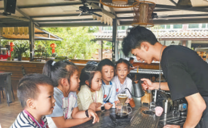 小凹子咖啡莊園內(nèi),咖啡師為前來研學(xué)體驗的小朋友們制作手沖咖啡。廖洪文 攝