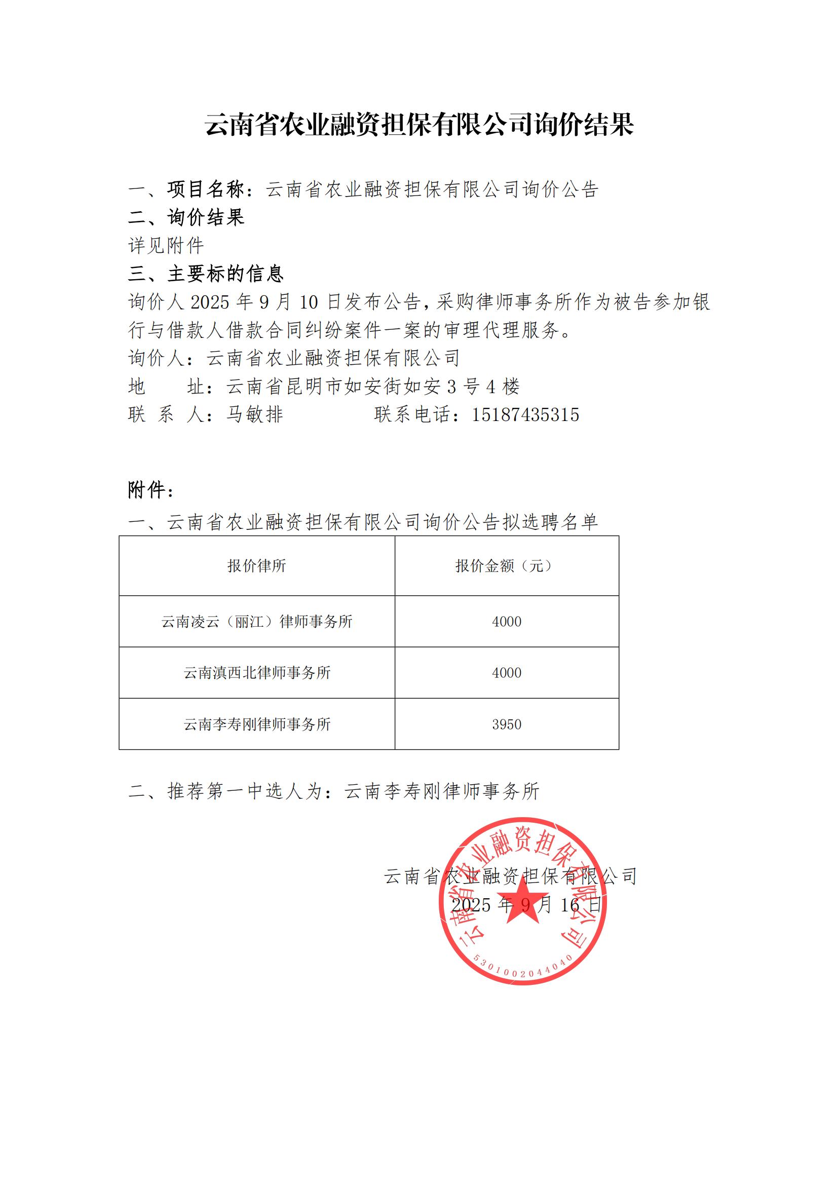 云南省農(nóng)業(yè)融資擔(dān)保有限公司詢(xún)價(jià)結(jié)果