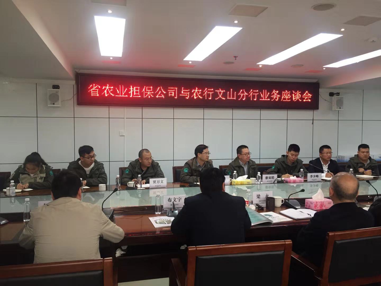 2018年11月27日,省農(nóng)擔(dān)公司董事長(zhǎng)郭影、副總經(jīng)理廖寅皓、農(nóng)擔(dān)二部副總經(jīng)理賈萬文以及辦事處負(fù)責(zé)人李少峰帶領(lǐng)文山、硯山辦事處人員前往農(nóng)業(yè)銀行文山州分行參加座談。出席座談的有農(nóng)行州分行梁永行長(zhǎng)、布文宇副行長(zhǎng)以及各分管部門領(lǐng)導(dǎo)。