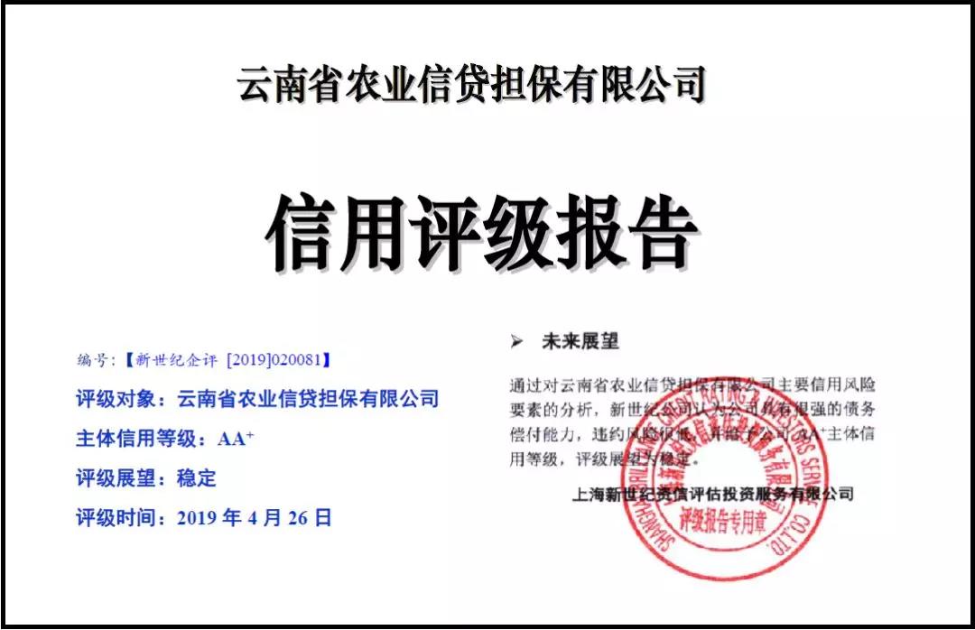 云南省農(nóng)業(yè)信貸擔(dān)保有限公司通過一年的努力,企業(yè)主體信用評(píng)級(jí)在2017年AA等級(jí)的基礎(chǔ)上再上一個(gè)臺(tái)階,2018年主體信用等級(jí)被評(píng)定為AA+,評(píng)級(jí)展望為“穩(wěn)定”,成為自全國農(nóng)業(yè)信貸擔(dān)保體系組建以來,第一批獲此殊榮的省級(jí)農(nóng)業(yè)擔(dān)保機(jī)構(gòu)。