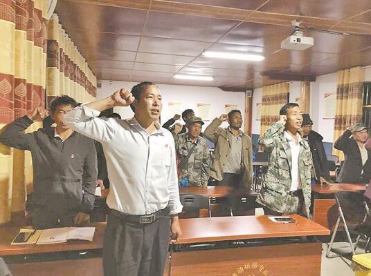 郭彩廷帶領(lǐng)膽扎社區(qū)第一黨支部黨員重溫入黨誓詞