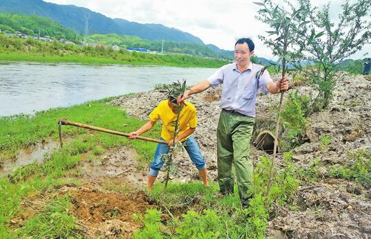 郭彩廷與鎮(zhèn)干部在猴橋鎮(zhèn)古永河邊義務(wù)植樹(shù)