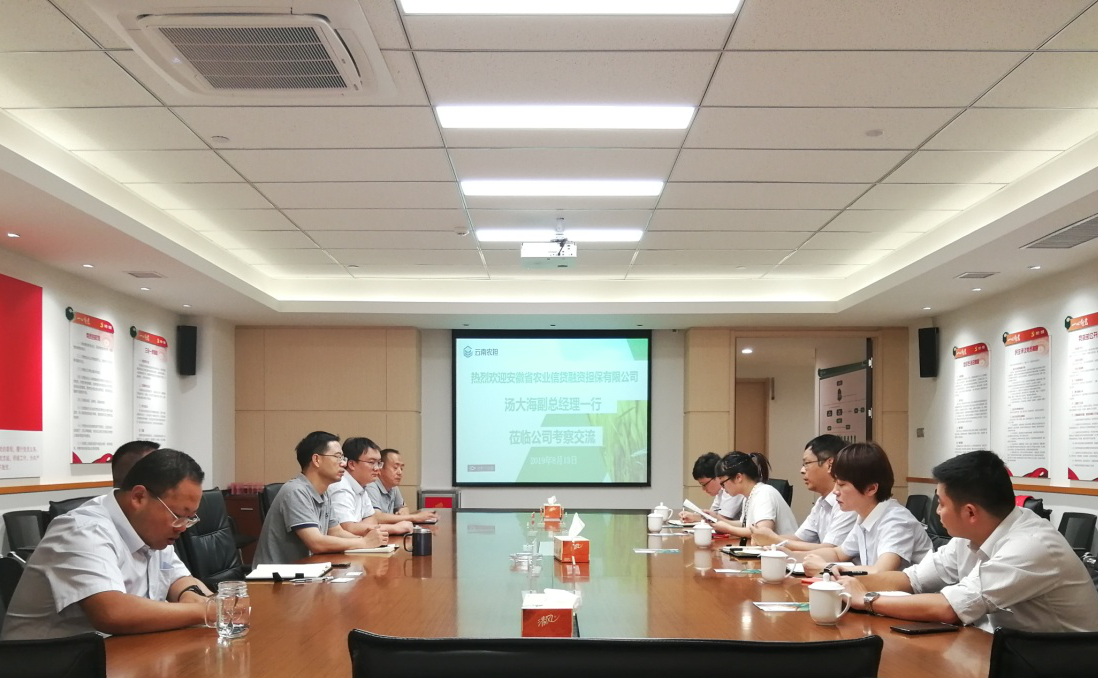 7月23日-7月25日,安徽省農(nóng)業(yè)信貸融資擔(dān)保有限公司(以下簡(jiǎn)稱安徽農(nóng)擔(dān))副總經(jīng)理湯大海率隊(duì)赴云南省農(nóng)擔(dān)公司調(diào)研交流。公司董事長(zhǎng)郭影、副總經(jīng)理廖寅皓率風(fēng)控部、戰(zhàn)略部與安徽農(nóng)擔(dān)公司進(jìn)行了座談交流。