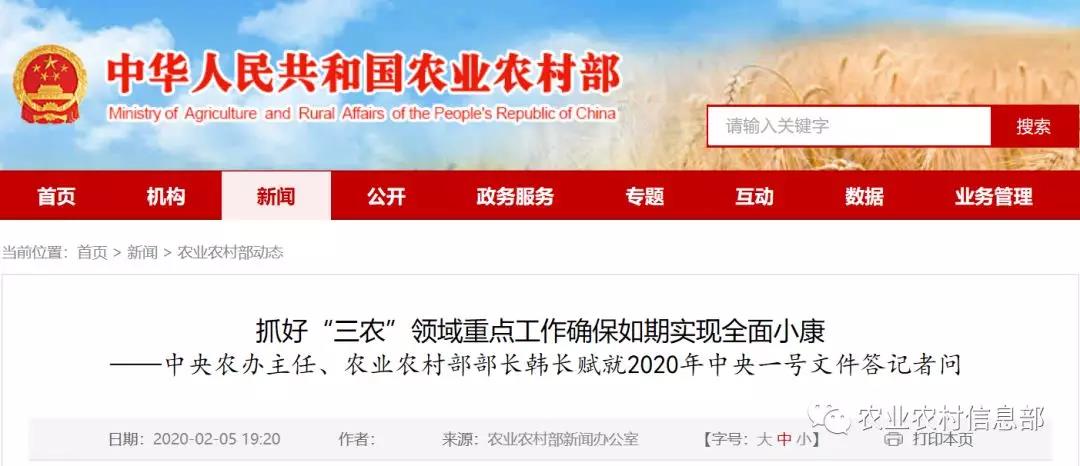 近日,中共中央、國(guó)務(wù)院印發(fā)《關(guān)于抓好“三農(nóng)”領(lǐng)域重點(diǎn)工作確保如期實(shí)現(xiàn)全面小康的意見》,也就是2020年中央一號(hào)文件。文件公開發(fā)布之際,中央農(nóng)辦主任、農(nóng)業(yè)農(nóng)村部部長(zhǎng)韓長(zhǎng)賦就文件制定印發(fā)和貫徹落實(shí)等問題,回答了記者的提問。