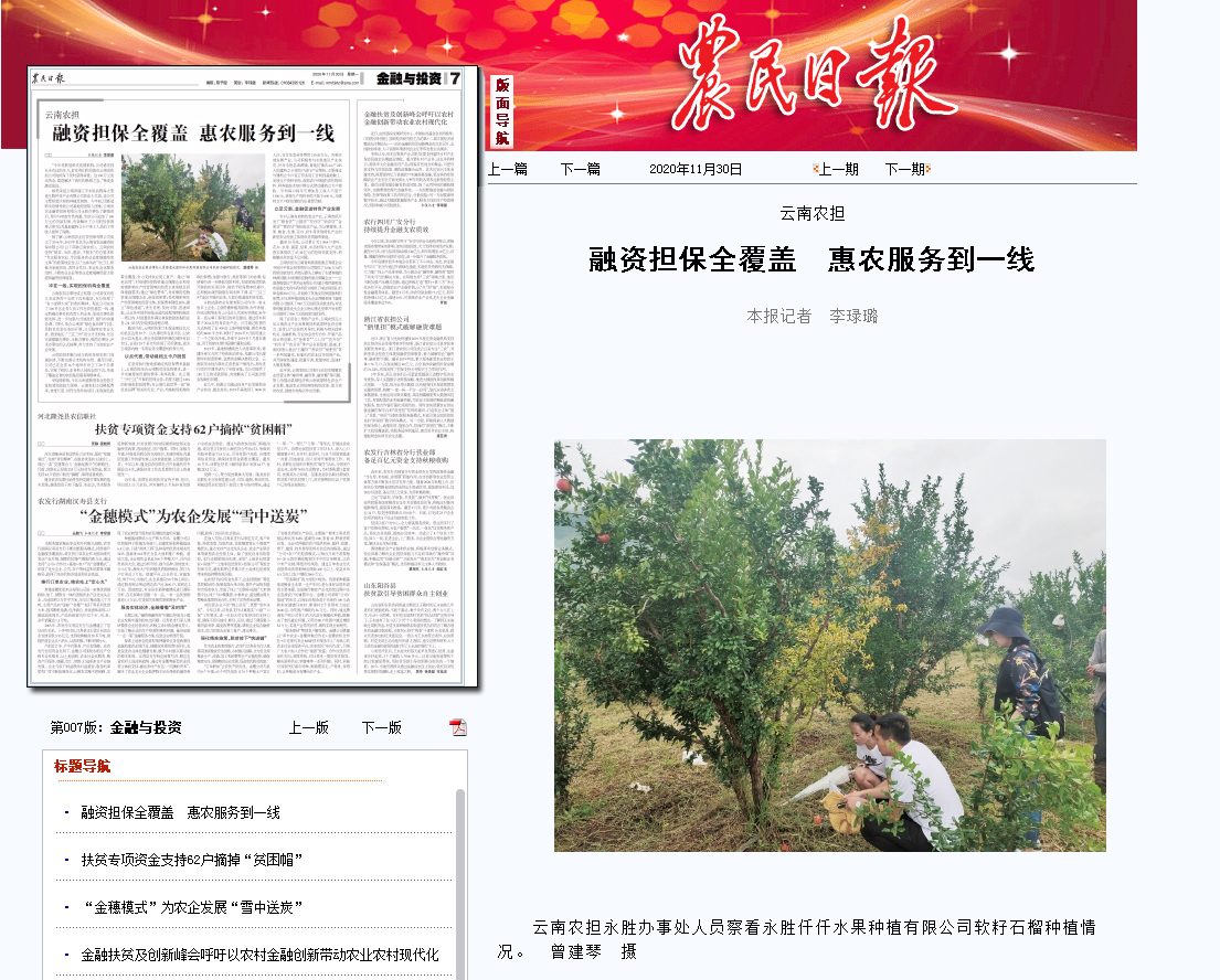 10月,國家農(nóng)擔(dān)公司微信公眾號“農(nóng)擔(dān)經(jīng)驗(yàn)談”專欄中對云南農(nóng)擔(dān)公司認(rèn)真貫徹落實(shí)云南省脫貧攻堅等扶貧政策,支持麗江永勝縣農(nóng)業(yè)生產(chǎn)、帶動貧困戶脫貧增收,積極為當(dāng)?shù)匦滦娃r(nóng)業(yè)經(jīng)營主體提供融資擔(dān)保服務(wù)進(jìn)行了宣傳?!掇r(nóng)民日報》從國家農(nóng)擔(dān)公司了解到云南農(nóng)擔(dān)支農(nóng)惠農(nóng)的相關(guān)情況后,11月30日以《融資擔(dān)保全覆蓋 惠農(nóng)服務(wù)到一線》為題報道了云南農(nóng)擔(dān)公司成立以來,不斷完善分支機(jī)構(gòu)布局,實(shí)現(xiàn)了機(jī)構(gòu)、業(yè)務(wù)和人員的全面下沉,形成了覆蓋全省的農(nóng)擔(dān)基層服務(wù)網(wǎng)絡(luò)體系,以點(diǎn)帶面、立足當(dāng)?shù)兀瑸橥苿涌h域經(jīng)濟(jì)和云南高原特色農(nóng)業(yè)產(chǎn)業(yè)發(fā)展、推進(jìn)農(nóng)業(yè)供給側(cè)結(jié)構(gòu)性改革、助力脫貧攻堅、助推“鄉(xiāng)村振興”戰(zhàn)略實(shí)施發(fā)揮了積極作用。