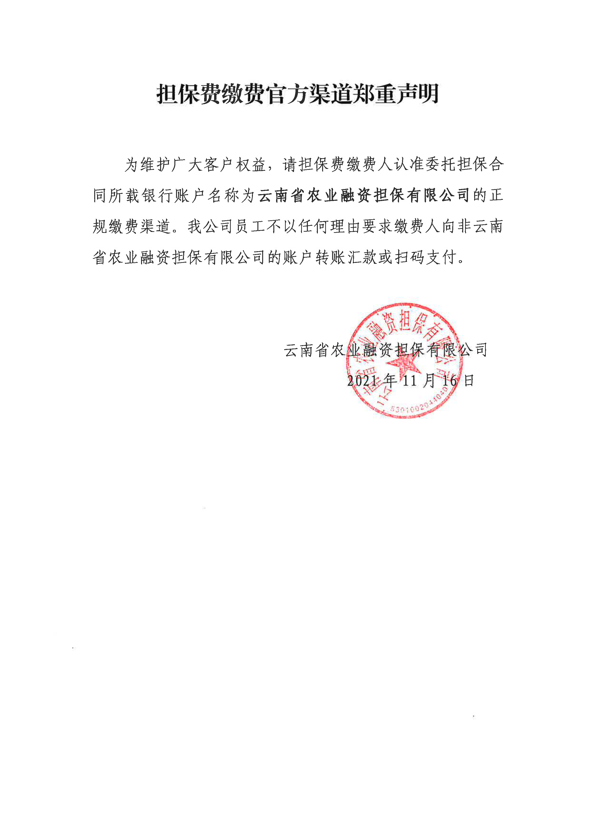 云南省農擔公司擔保費繳費官方渠道鄭重聲明