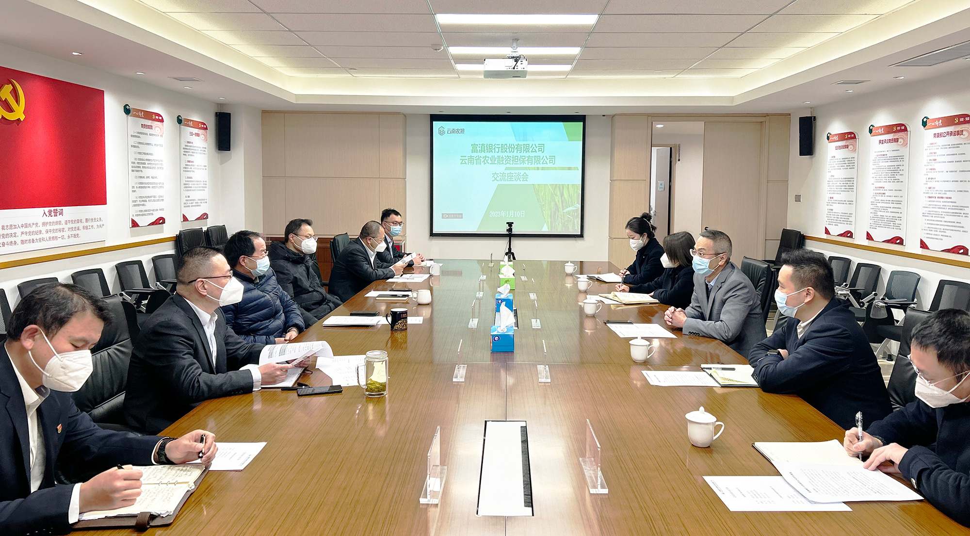 2023年1月10日,云南省農(nóng)業(yè)融資擔(dān)保有限公司與富滇銀行股份有限公司召開銀擔(dān)合作座談會。富滇銀行黨委委員、副行長納然,公司董事長杜開波、總經(jīng)理李世偉、副總經(jīng)理廖寅皓出席會議。會議圍繞2023年雙方合作目標(biāo)展開討論,并就推進(jìn)下一步戰(zhàn)略合作達(dá)成共識。