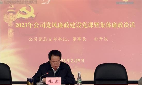 2月9日,云南省農(nóng)業(yè)融資擔(dān)保有限公黨總支部書記、董事長杜開波在公司年度工作會議上,為全體職工上了一堂黨風(fēng)廉政建設(shè)專題黨課,并作集體廉政談話。省公司全體職工、州市分支機(jī)構(gòu)負(fù)責(zé)人、主管等現(xiàn)場聽課,各州市分支機(jī)構(gòu)全員通過視頻方式聽課。