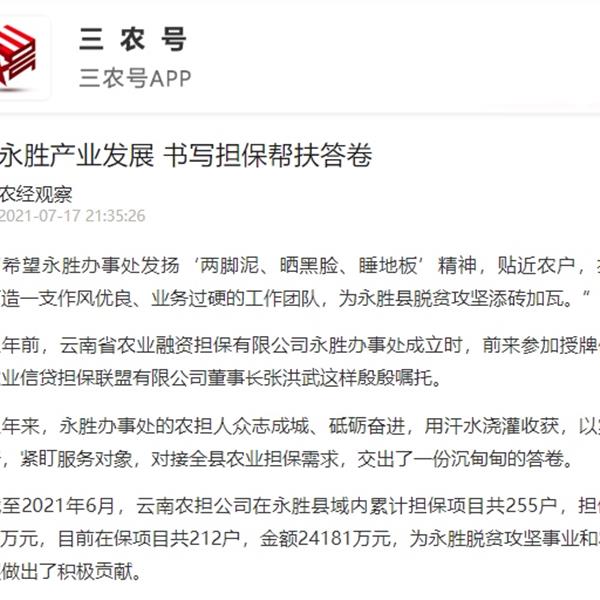2021年7月17日,《農民日報》三農號以“助力永勝產業(yè)發(fā)展 書寫擔保幫扶答卷”為題對云南農擔永勝辦事處進行了專題報道。