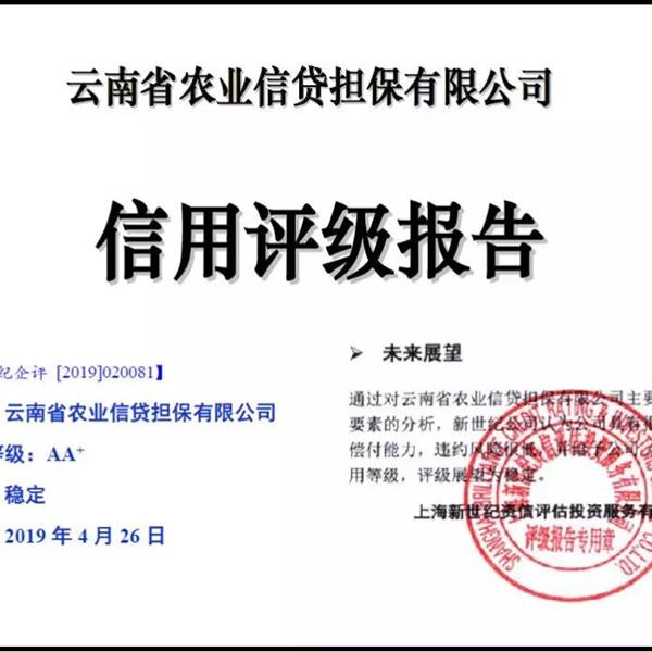 云南省農(nóng)業(yè)信貸擔保有限公司獲得AA+企業(yè)主體信用評級